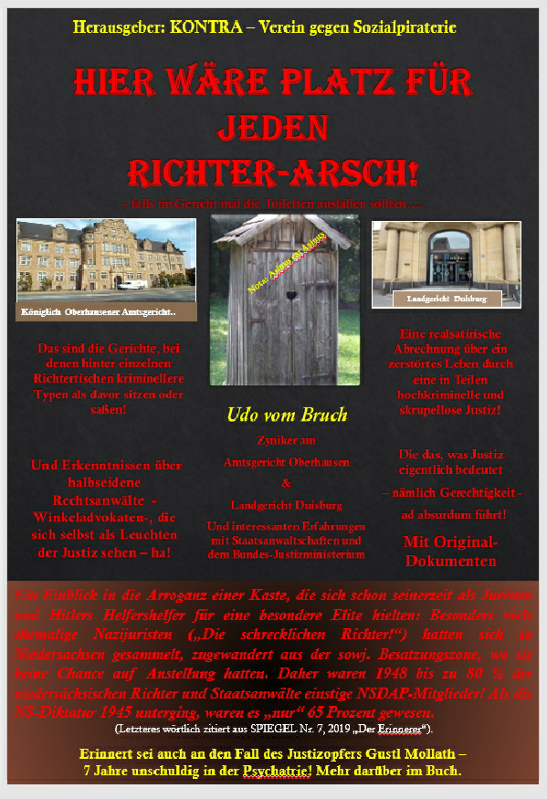 Natürlich ist uns klar, dass uns irgend jemand wg. des Titels wieder an die Wäsche will. Aber keine Sorge: Wir haben dem Leiter der Generalstaatsanwalt Düsseldorf den Titel schon vor Monaten vorab zugeschickt. Um ihm einen Ermittlungsansatz zu ersparen…… Bisher ist noch nichts gekommen…… Aber wieso sollte auch? Schliesslich bieten wir gem. der Verpflichtung unserer sozialen Organisation KONTRA ja nur fürsorglich unsere Hilfe an -